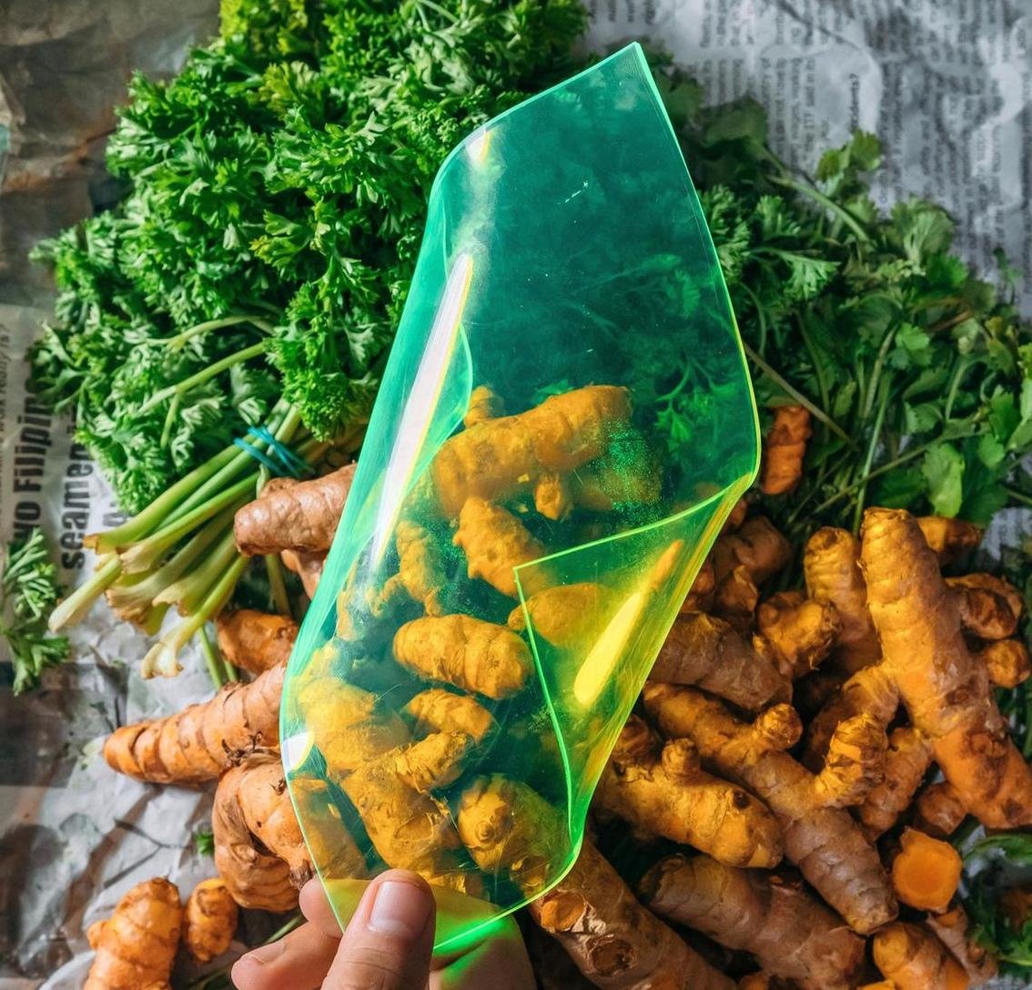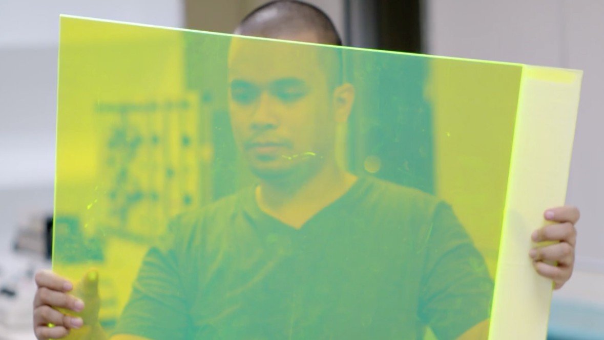 Particles are derived from fruits and vegetables and suspended in a resin substrate. When hit by sunlight, the particles absorb and emit light along the edges. Then, the light is captured and converted to electricity.