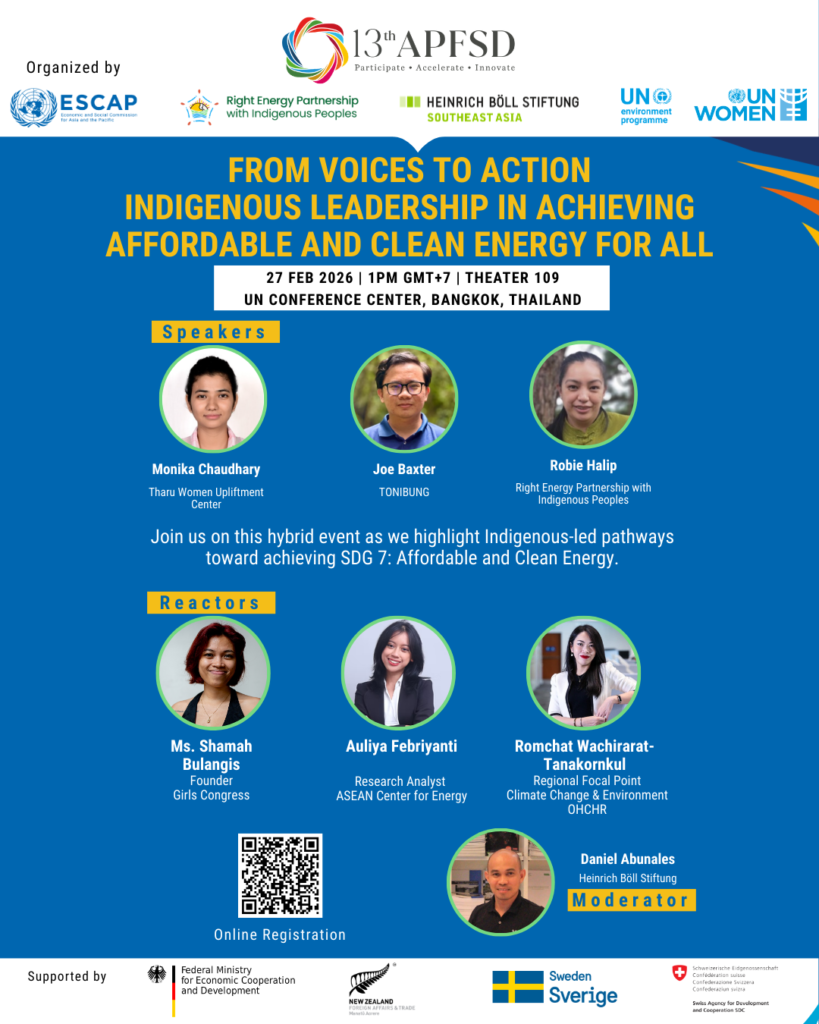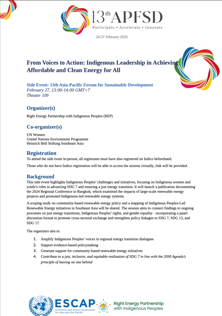 This side event, convened by the Right Energy Partnership with Indigenous Peoples (REP) in collaboration with UN Women, UN Environment Programme, and Heinrich Böll Stiftung Southeast Asia, will highlight Indigenous-led pathways toward achieving SDG 7: Affordable and Clean Energy.